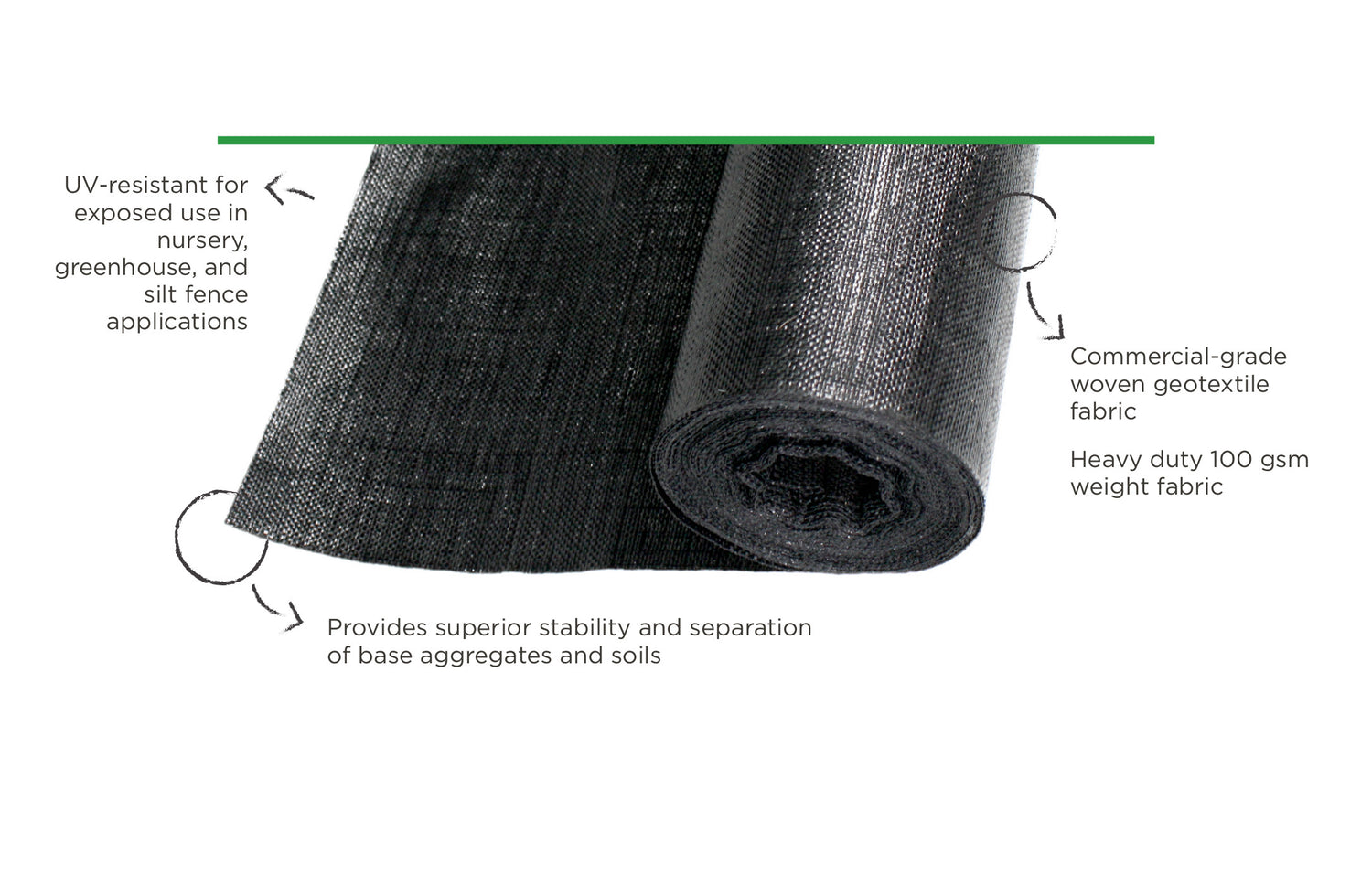 DuraWeave™ Ultimate Hardscape Stabilizer & Ground Cover Fabric provides superior stability and separation of base aggregates & soils. It also offers UV resistance for exposed use in nursery, greenhouse, or silt fence applications. Ideal for non-permeable surfaces and construction projects- including asphalt and concrete driveways, paths, parking lots, roads, silt fences, and nursery ground cover.