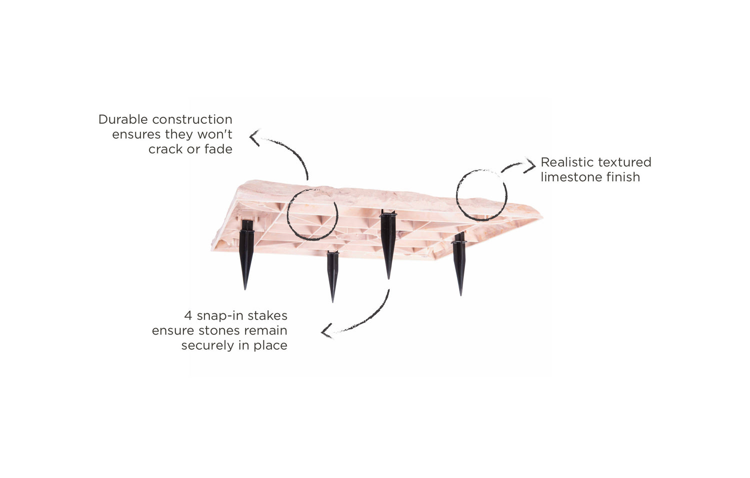 Add beauty and functionality to your landscape, garden or yard with Gardien® Stepping Stones. Made from lightweight all-weather resin, these square-shaped stepping stones are easy to transport & install and will last for years. Create custom decorative walkways in minutes! The realistic textured limestone finish won’t crack or fade, even in harsh conditions. Each stepping comes with 4 heavy-duty stakes to secure it in place.